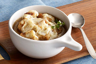 HEAT broiler. Ladle soup into 4 large ovenproof bowls; top with croutons and cheese. Broil 2 to 3 min. or until cheese is melted.