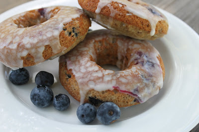 Mix all the dry ingredients in a bowl. Crush your berries with the back of a fork. In a separate bowl, mix together milk, eggs, oil, blueberries and water. Pour the liquid mixture into the dry ingredients and stir just until combined. Bake at 325 degrees for 16-18 minutes in a 6-doughnut pan or in a mini doughnut maker according to manufacturer directions. Alternatively, you can bake them in lined mini muffin tins for 7-12 minutes, or until a toothpick inserted in the center comes out clean. While the doughnuts are cooling make your glaze.