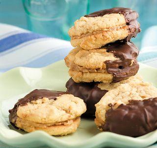 Combine powdered sugar with remaining peanut butter; spread one rounded teaspoon on flat side of half the cookies. Top with remaining cookies. Refrigerate 30 minutes. in a microwave-safe bowl, microwave chocolate chips and oil one minute; stir until melted. Dip cookies halfway into melted chocolate. Let excess drip off. Refrigerate on wax paper-lined baking sheets until set.