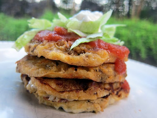 Heat a lightly oiled griddle or frying pan over medium high heat. Pour or scoop the batter onto the griddle, using approximately 1/4 cup for each pancake. When bubbles begin to appear on the surface, flip carefully with a spatula, and cook until browned on the underside, 1 to 2 minutes more. Serve stacked and topped with salsa, sour cream and lettuce.