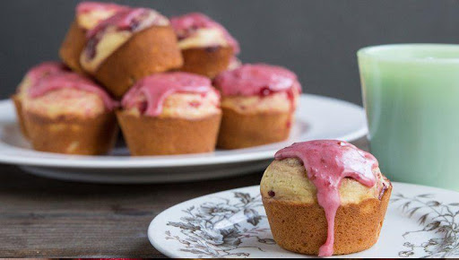 2 In large bowl, stir together flour, granulated sugar, baking powder and salt with whisk. In medium bowl, beat yogurt, agave nectar, butter, vanilla and eggs with whisk. Add flour mixture to wet mixture; stir with whisk just until combined. Spoon batter evenly among muffin cups, filling each about two- thirds full. (Use a decorating bag if you want to be more exact).