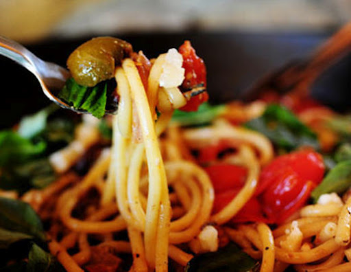 Heat olive oil in a skillet over medium-high heat. Add sliced red onions and cook until slightly caramelized. Add halved tomatoes and cook for a couple of minutes. Pour in broth or wine and cook for another two minutes, then pour in garlic/anchovy/olive mixture. Stir and continue cooking for several minutes, or until sauce is nice and reduced and wonderful. Add salt and pepper to taste.