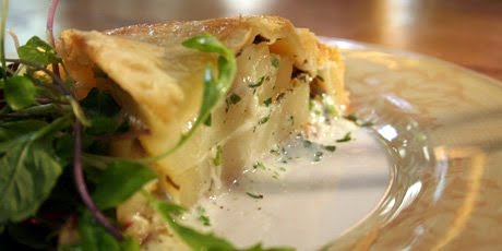 2. About an hour before eating, heat the oven to 400°F/200°C. Slice the potatoes into neat 1/4-inch/5 mm rounds. Roll one sheet of the pastry into an 11-inch/28 cm circle and lay it on a greased baking sheet. Leaving a 1-inch/2.5 cm margin all around, cover with an overlapping layer of potato slices. Season with salt and pepper. Spread over a layer of the cream mixture. Repeat the layering, tapering in a bit as you go, until all the potatoes and cream have been used and the end result looks like an upside-down double-crusted pie. You should have about three layers each of potato and cream.