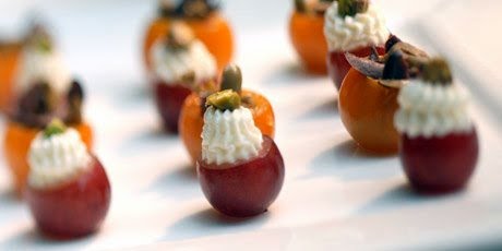 Wash grapes and cut a very thin slice of skin off of the bottom of each grape so that they will sit upright. Cut the tops off and discard. Scoop out some of the flesh with a sharp paring knife to create a small cavity in each grape.