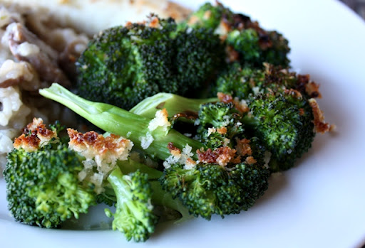 Spread the panko into a 13 by 9-inch metal cake pan and place into the oven for 2 minutes or until lightly toasted. Remove the panko from the oven and add to the bowl with the broccoli mixture. Toss to combine. Return the mixture to the cake pan, place in the oven and roast just until the broccoli is tender, 8 to 10 more minutes. Remove from the oven, toss in the cheese and serve immediately.