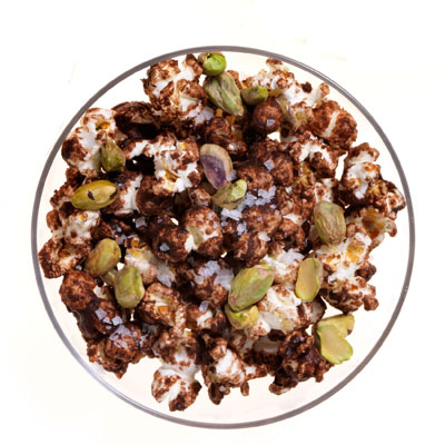In a large bowl, combine popcorn with remaining ingredients. Add sugar mixture, tossing to coat. Spoon mixture in a single layer onto 2 rimmed baking sheets; bake 3 minutes, until mixture is warm and dry.