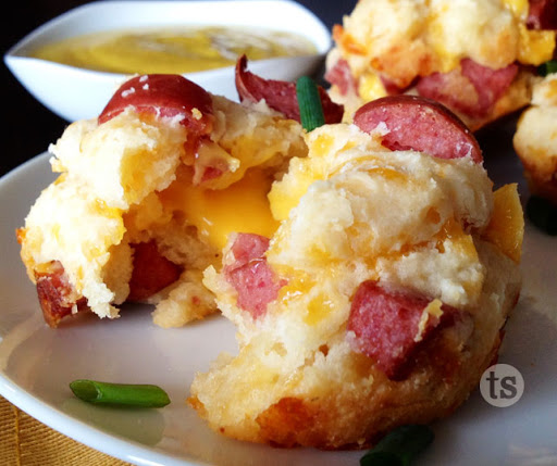 Preheat oven to 375°. Combine first 3 ingredients; stir until moistened. Divide mixture evenly into 24 greased mini muffin pan cups. Press 1 piece of hot dog (or meat of choice - or none ;-) and 1 piece of cheese into batter of each muffin cup. Bake 12-15 minutes or until golden brown. Serve warm with mustard. Makes 24 mini muffins.