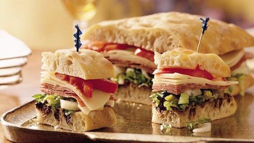 Let guests make their own sandwiches! Place small bowl of olive tapenade in the center of a large platter. Arrange tomato and onion slices around the bowl, and arrange lettuce, salami and cheese around edge of platter. Place sliced bread in a basket. Place party pick in each sandwich and arrange on a platter. Garnish platter with a radicchio leaf filled with olives or fresh herbs.