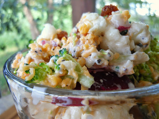 1. Mix broccoli, cauliflower, Cheddar cheese, onion, and crumbled bacon together in a large bowl.