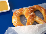 Preheat the oven to 450 degrees and grease a large baking sheet. Punch the dough to deflate it, then turn out onto a lightly floured surface. (If the dough seems tight, cover and let rest until it relaxes.) Divide the dough into 6 pieces. Roll and stretch each piece with the palms of your hands into a 30-inch rope, holding the ends and slapping the middle of the rope on the counter as you stretch. Form each rope into a pretzel shape.