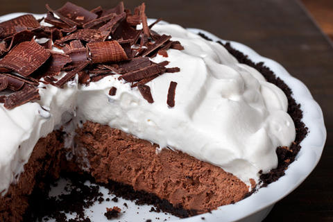 In this recipe three simple components come together to make a pie that is equally worthy of serving at a dinner party or a casual potluck. First an easy chocolate cookie crust is pressed into a pie plate and baked until just set. Then an intensely flavored but lightly textured chocolate mousse is piled in. Last, a sweetened whipped cream is layered on top. If you’re feeling fancy, sprinkle on some chocolate shavings.