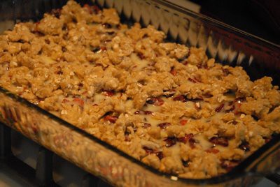 Preheat oven to 350F. In a large bowl, cream butter and brown sugar until light and fluffy. Combine oats and 1-1/2 cups (6 3/8 ounces) flour; add to the creamed mixture until blended. Set aside 1-1/2 cups for topping. (Let me stop here and say that I have never creamed butter and sugar together in a recipe like this. Typically, you cut the butter into the sugar and/or flour. Obviously, a creamed butter/sugar mixture is going to be very wet, and even with all the flour and oats, the crumbs were still quite sticky. I might try cutting in the butter next time to see the difference.)