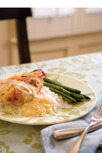 5.In a small bowl, combine soup, water, and remaining evaporated milk; pour over chicken. Return chicken to oven, and bake for 35 minutes longer. Remove chicken from baking dish; whisk gravy in baking dish until smooth. Serve chicken and gravy with rice and asparagus, if desired.