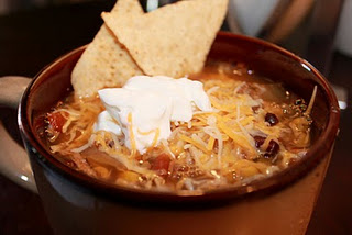 To serve put a few tortilla chips in the bottom of a bowl, ladle soup over tortilla chips, top with shredded cheddar cheese, (today I used the Kraft Mexican blend and it was yummy), and a dollop of sour cream, serve with more chips if you like. Enjoy!