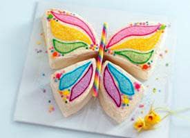 2. Cut cake in half crosswise; cut each half into 1/3 and 2/3 pieces (as shown in diagram). Place cake pieces on platter to form butterfly. Gently separate cake pieces to form wings.