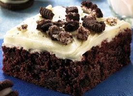 3. Bake 24 to 26 minutes or until toothpick inserted 2 inches from side of pan comes out clean or almost clean. Cool completely, about 1 hour. Frost with frosting. Sprinkle with 2/3 cup chopped cookies. For 20 brownies, cut into 5 rows by 4 rows.