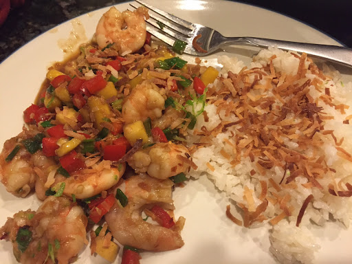 While rice is cooking, toast the coconut by spreading onto a rimmed sheet pan. Toast in a 350°F oven, stirring frequently, until the coconut is an even brown color, about 10 minutes.