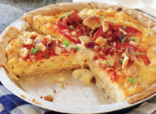 4. Cook, stirring constantly, over medium-low heat until bubbly, approximately 2 minutes. Remove from heat. Add 1/2 cup Cheddar and provolone; stir until cheese melts. Stir in macaroni. Spoon mixture into prepared crust. Top uiith remaining 1/4 cup Cheddar, tomato, crackers, and bacon.