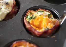 Spray non-stick muffin pans or ramekins with Pam. Wrap a slice of bacon around the inside of the cup and put pieces of bacon at the bottom. Break an egg inside the bacon cup and top with salt and pepper. Add cheese and herbs and bacon until set, about 15 minutes.