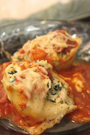 Fill each shell with mixture and place filled shells in the baking dish on top of the sauce. Spread remaining sauce on top. Sprinkle with remaining cheese and salt and pepper to taste. Bake for 30 minutes.