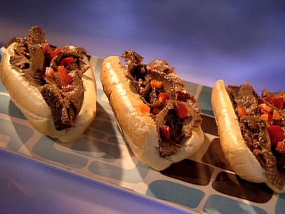 Reheat the broth, and add the sliced meat. Place some meat on each toasted roll, ladle with some broth and top with giardiniera vegetables and red peppers.