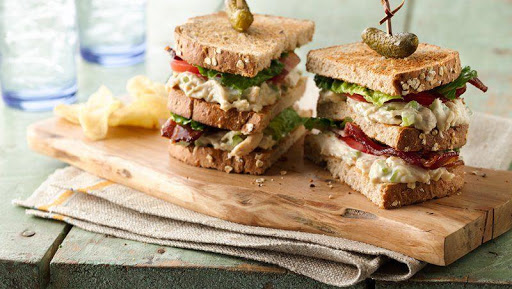 2 Spread 1/2 cup chicken mixture on one side of 2 bread slices. Layer each with 2 tomato slices, 2 half slices of bacon and 1 lettuce leaf. Top each with another bread slice. Repeat layers, starting with chicken mixture. Top each with third bread slice.