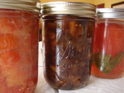 Put tomatoes and basil into hot, sterilized canning jars. Cover with hot water mixture, leaving 1/2 inch space at top. Wipe off rims of filled jars with a clean, damp kitchen towel, then top with lids and screw on “finger tight” (just screwed on with your fingertips, not cranked tight with your palm).