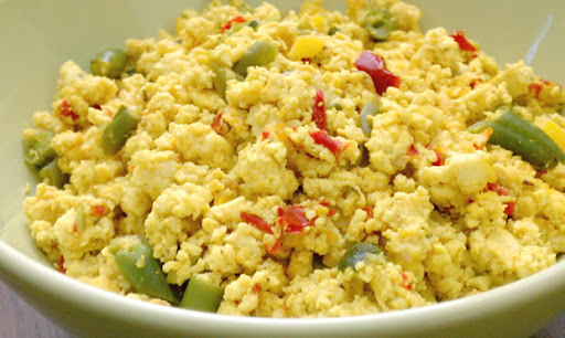 Just a base recipe for scrambled tofu. Use frozen veggies or clean out the fridge with this tasty dinner. The turmeric makes it look like scrambled eggs and the kala namak salt makes it taste like eggs too!