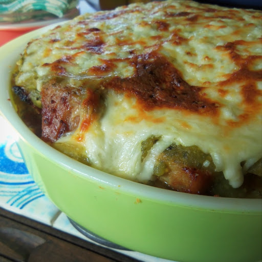 6. Once cornbread is done, remove from oven. Top with half of the salsa verde. Spread out the carnitas evenly, add the remaining salsa and top with reserved chile peppers and cheese. Bake just until cheese melts, then brown under the broiler for a few minutes. remove from oven and let sit for 15 minutes before serving.