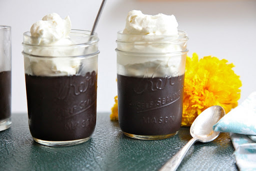 For the whipped cream, whip together heavy cream, sugar, vanilla bean, and a pinch of salt. Dollop over cold pudding and serve.