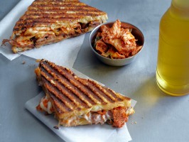Pile the pork, cheese, a drizzle of the sauce, some kimchi and more cheese between the bread slices to make 4 sandwiches. Grill in a panini press.