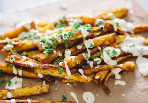 - To serve, spread fries over plate or serving platter, drizzle cashew cream sauce over top, sprinkle all with maldon salt and garnish with a small handful of fresh chopped curly leaf parsley. Enjoy!