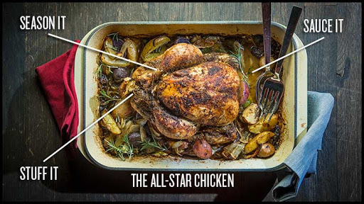 Sauce it like Andrew Carmellini. Roast your chicken atop a bed of tomatoes, potatoes, onions, green olives and rosemary seasoned with salt, pepper and a little olive oil. Afterwards, make a sauce right in the pan; hit it with store-bought stock and "a little Banyuls vinegar to brighten it up," like the chef of NYC's The Dutch and Lafayette does.