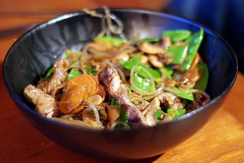 Anne: I love the bite of the noodles, made from sweet potato starch - they were easily found at the Asian supermarket I went to, and they're really what's essential for this dish. I think you can pretty much free-style it from there, to adapt this to your own favorite noodle dish. I didn't stray very far this time, but will definitely add some more flavors next time - maybe some garlic and ginger...