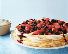 5. To assemble, lay one crepe on a serving platter. Spread evenly with 1/4 cup (60 mL) whipped cream. Repeat, using all the crepes and whipped cream. Top with apple-blueberry mixture. Cut into eight wedges and serve with additional whipped cream, if desired.