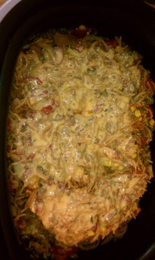 Preheat: Stove Top High. Add EVOO and sauté the dry vermicelli noodles, until lightly browned, stirring to keep from burning. Add beef and cook, stirring, until meat losses it red color. Add: garlic, onion, green pepper, celery, corn, salt, pepper, & chili powder. Add tomatoes, water and (Rotel). Gently stir. Place lid. Turn Ninja to 325° for about 25 minutes. Stir after 15 minutes. Test to see if celery and green pepper are getting soft. When soft, top with cheese slices. Turn off unit. Place lid, for cheese to melt.