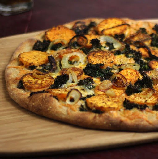 While vegetables are cooling, prepare pizza dough. Brush with remaining Tbsp of olive oil. Spread garlic evenly over oiled dough followed by the mozzarella. Arrange Kale, sweet potatoes and onion on top of pizza. Finish with Parmesan. Bake at 500 degrees until crust is golden and vegetables begin to crisp, approximately 12 minutes.