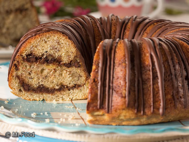 4. Spoon 1/3 of the cake batter into Bundt pan and sprinkle with half the walnut mixture. Spoon another 1/3 of the cake batter into pan, and sprinkle with remaining walnut mixture. Cover with remaining cake batter.