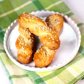 To shape the cookies, pinch off a piece of dough about the size of a walnut. Roll out a cord or thin tube of dough about the length of a dinner knife. Fold in half then twist two times. Pinch the remaining edges together and tuck underneath.