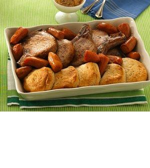 2. Move pork chops and sweet potatoes to one side of pan; drain and discard drippings. Separate dough into 5 biscuits; arrange in pan next to pork chops and potatoes. Drizzle syrup over pork chops, potatoes and biscuits.