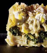 4. Lightly grease an 8-inch square glass baking dish. Layer in half of the noodles and press with a spatula. Dot with half of the goat cheese, spread the spinach on top and press down. Stir 3 tbsp. pesto into the remaining noodles and spoon over the spinach. Dot with the remaining cheese. Cover snugly with foil and bake until hot and bubbling, about 35 minutes. Let stand for 10 minutes.