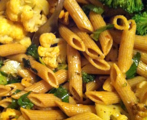 Bring a large pot of water to a boil over high heat; add pasta and boil until almost al dente. Add broccoli and cauliflower florets to pot and continue boiling until pasta and vegetables are both just-tender. Drain; reserve a bit of cooking water.