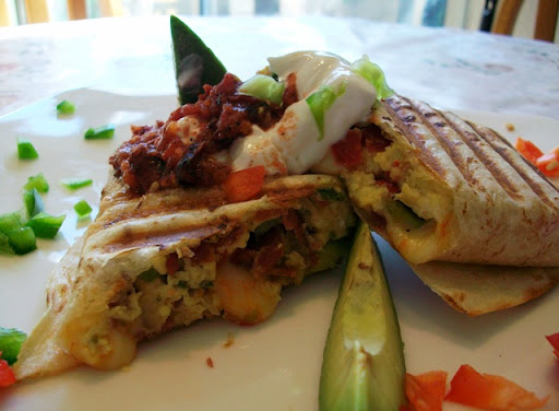 Wrap tortillas in foil; warm in a 400 degree F oven. While the tortillas heat, sauté bell pepper and onion in butter until soft, about 5 minutes. Meanwhile beat together eggs and salt and black pepper. When vegetables are done, pour egg into pan, add cooked crispy bacon. Cook, over medium-low heat, stirring constantly, until soft curds form, about 3 minutes. Put 1/4 of the egg mixture down the center of one warmed tortilla; add some avacado and sprinkle with 2 tablespoons cheese . Fold in top and bottom of each tortilla. Roll up from side. Repeat with each tortilla. Garnish each burrito with a spoonful of salsa, a dollop of sour cream and cilantro.NOTE: I used a panini press for the burrito as shown in the picture. However, if you decide to use it, do not add the avacado, instead garnish the burrito with the avacado.