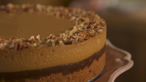 Spoon the dulce de leche topping over the cream cheese filling, add the pecans all around the edge and place the pan back in the oven for 10 more minutes. Remove from the oven and let the cheesecake cool to room temperature. Cover and refrigerate for at least 4 hours before serving. It tastes even better if it chills overnight.