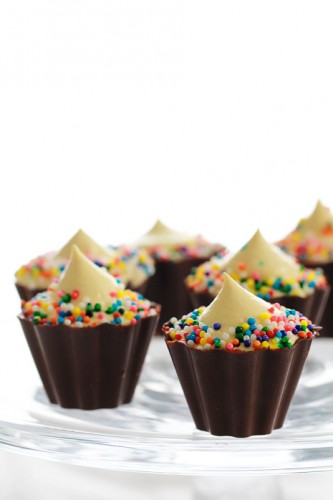1. Melt chocolate. Using a small paint brush, cover the walls of form* and chill for 5 minutes. Remove and apply a second coat and chill once more. The chocolate cups can be made 3 days in advance and kept at room temperature or stored in the refrigerator.