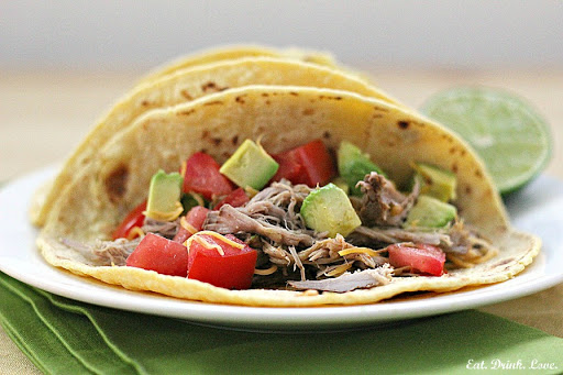 Once pork is cooked, shred with two forks and mix with sauce again. 1 serving yields 3/4 cup of meat mixture. (The pork alone has a PPV of 4 per serving.) After placing in tortillas, top with lettuce, salsa and whatever else you prefer on your tacos. ENJOY!