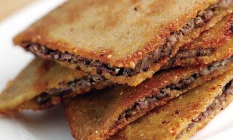 Put a small amount of the filling on one of the discs; spread it to a very thin layer of less than ½cm thick and about ½cm away from the edge; this will leave enough dough to close the edges together. Very carefully, using the wet cloth, ease the other piece of dough over the one containing the stuffing and place it so they fit on top of each other. Seal them together using your fingertips and keep the wet cloth over them. Place some cling film on top to stop the dough drying, and carefully leave aside while you make the others.