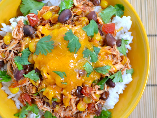 STEP 1: Add everything except the rice, cheese, and cilantro to the slow cooker along with 1/4 cup of water (for good measure). Give everything a good stir and make sure the chicken is covered in the mixture.