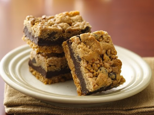 In another medium mixing bowl, break up the cookie dough and stir in the remaining 1/2 cup graham cracker crumbs until blended. Crumble the mixture evenly over the chocolate layer and the sprinkle the remaining 3/4 cup toffee bits on top.