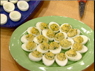 Spoon equal amounts of the mixture into the egg white halves and chill well before serving.